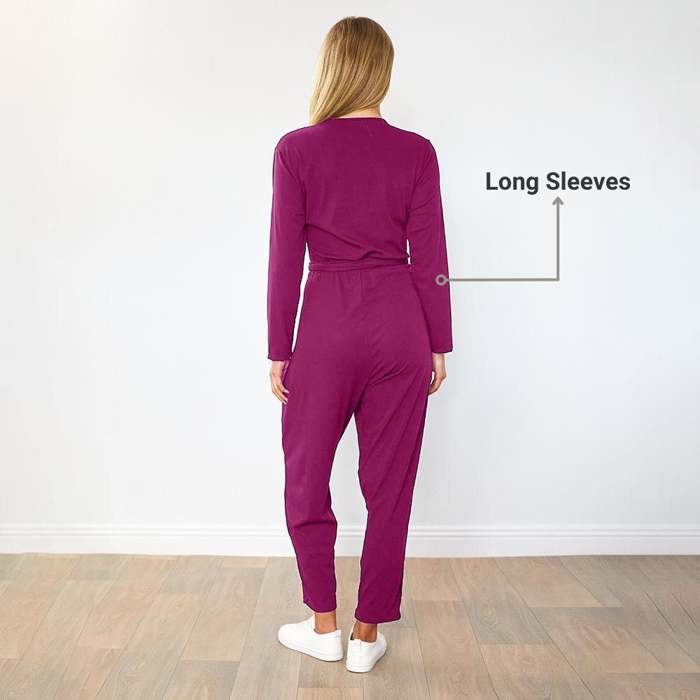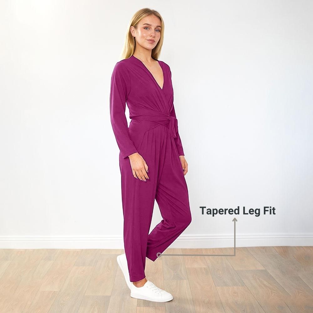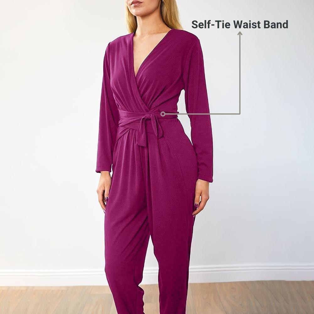 Own the moment in the Cliona Jumpsuit — where sleek meets effortless. The wrap style design frames your neckline to perfection, while the self-tie waist belt sculpts your shape just the way you like it. Long sleeves add that touch of polish, and the tapered leg fit keeps it chic from day to night. Confidence never looked this easy.