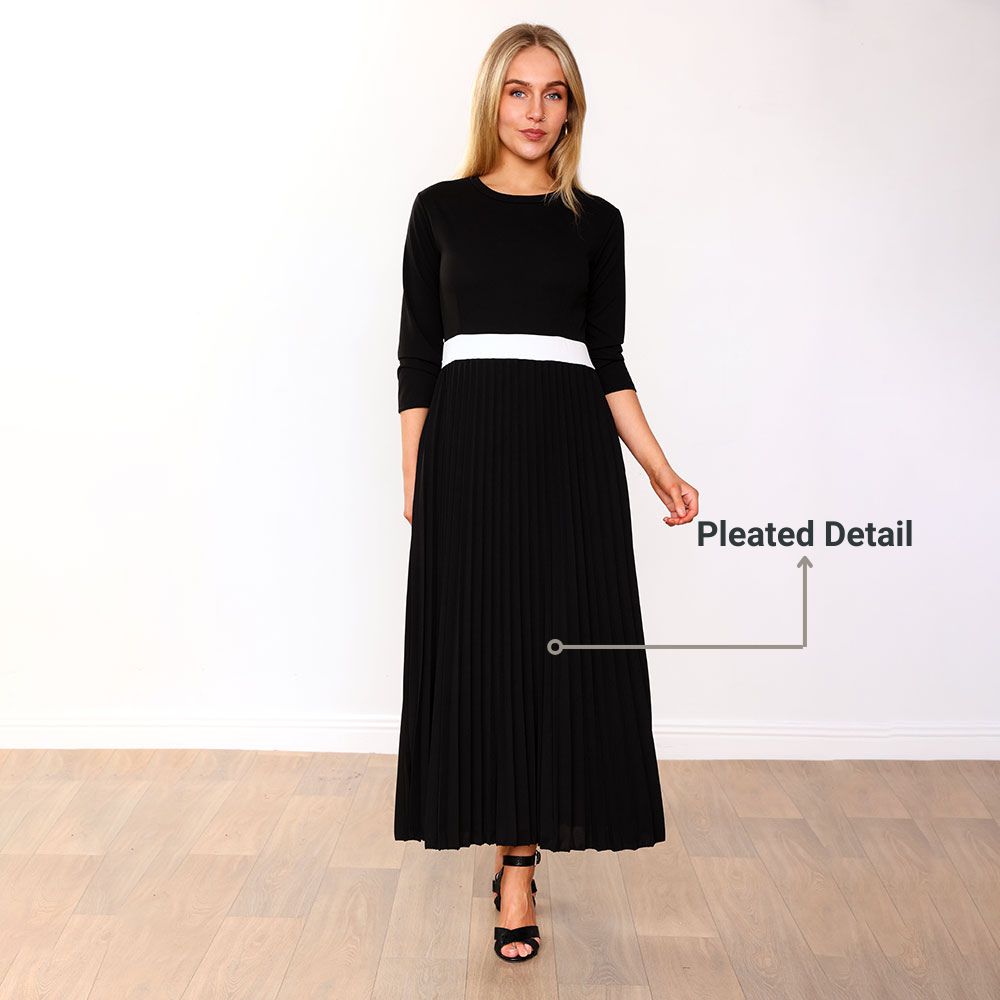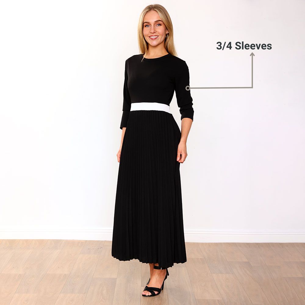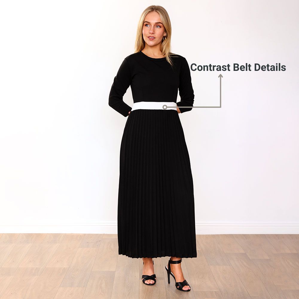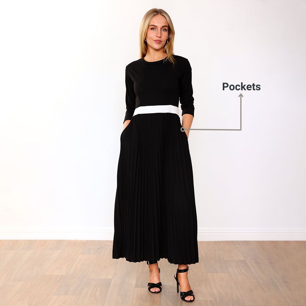 Meet the effortlessly elegant Doyle Dress. Chic and timeless, she features a flattering Round Neckline, sophisticated 3/4 Sleeves, and a striking Contrast Cream Belt Detail that defines the waist to perfection. The Fitted Bodice creates a sleek silhouette, while the Pleated Skirt flows gracefully with every step. And yes — she’s got Pockets, because practicality never goes out of style. ✨