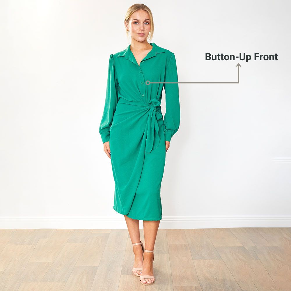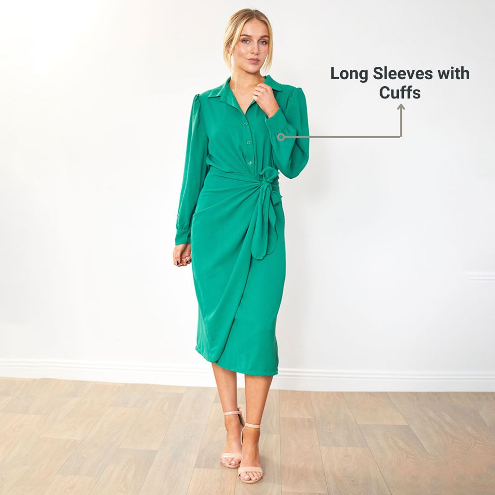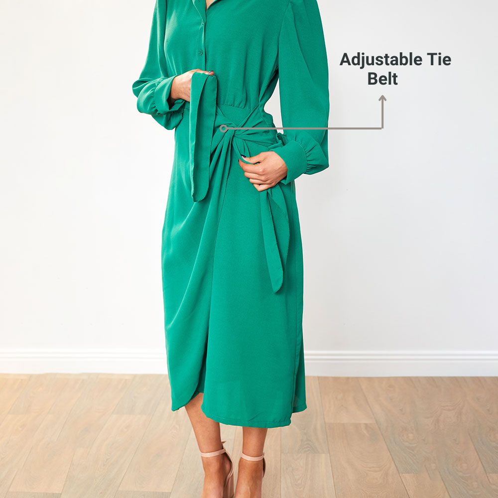The Emerson Wrap Dress is where sophistication meets effortless allure. 💚 Its collared neckline brings tailored polish, while the long sleeves with cuffs add a touch of refined charm. The button-up front gives it that smart, structured edge — perfectly balanced by the fluid wrap silhouette. And the adjustable tie belt cinches the waist just right, creating a shape that feels as good as it looks. Every detail is designed to flatter, flow, and make an unforgettable impression — because the Emerson Wrap Dress doesn’t follow trends, it defines them. ✨