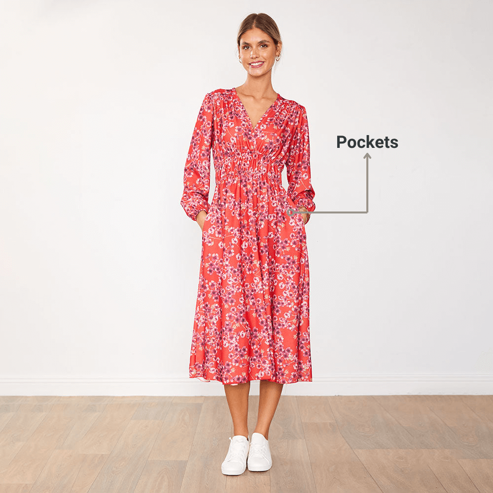"The Red Floral Gina Dress is a showstopper! The vibrant color and floral pattern are beautiful, and it fits like a dream." – Natalie H.
