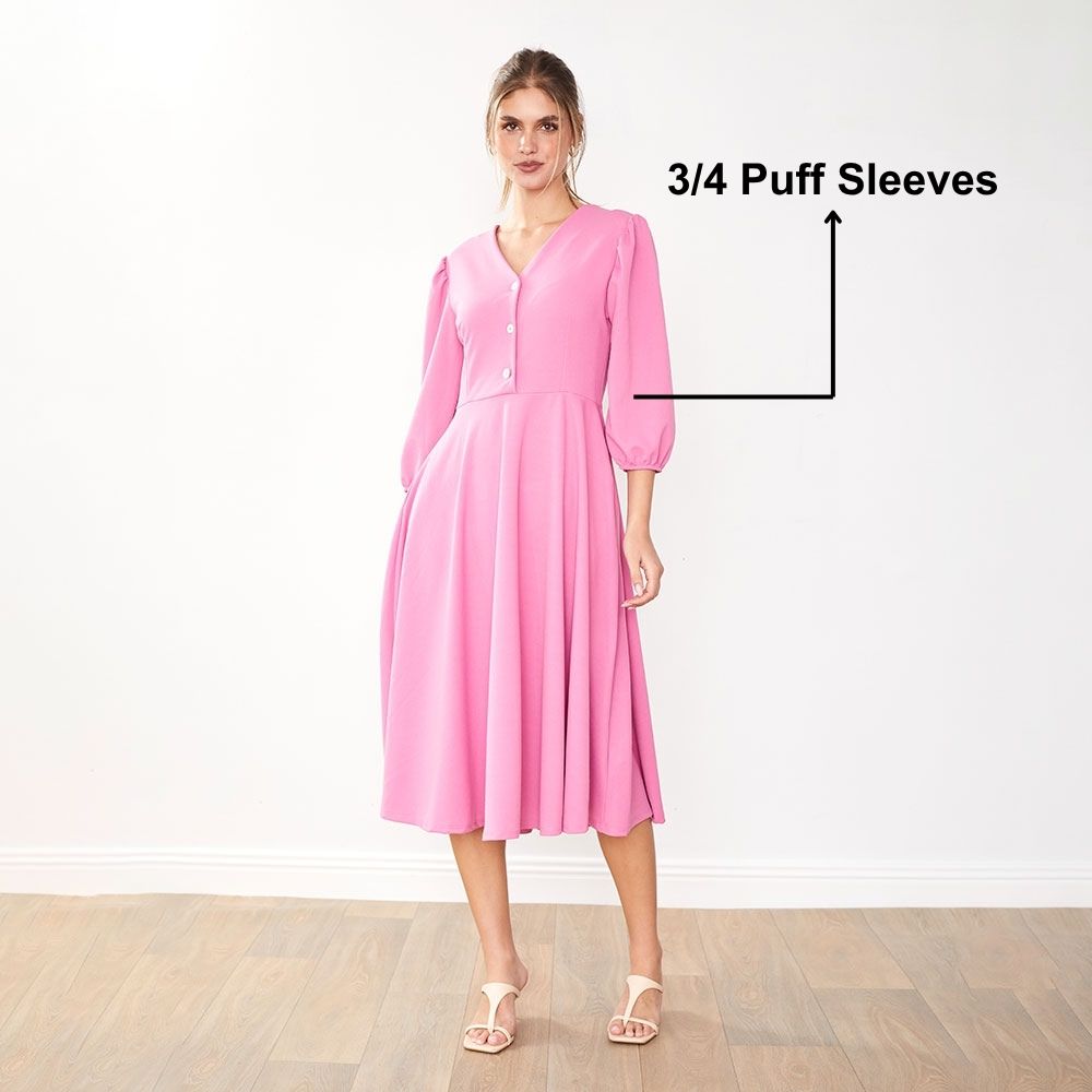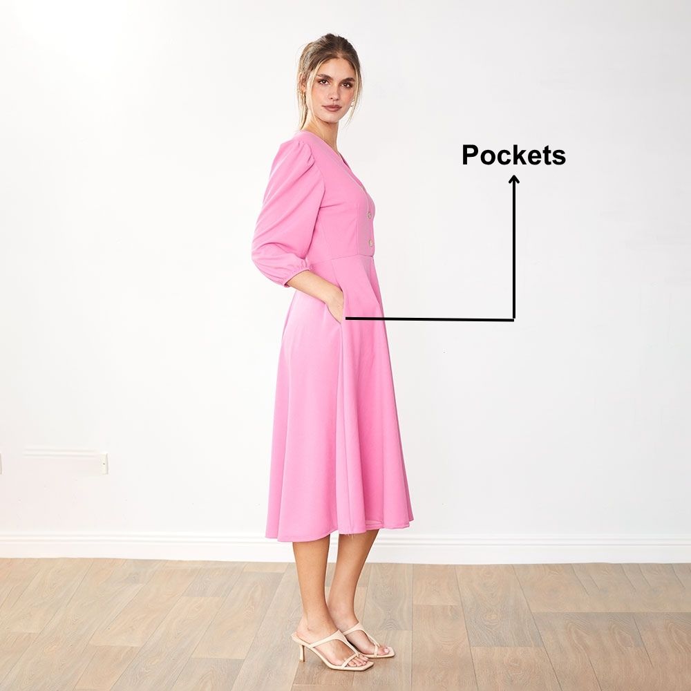 The Maisy Dress is effortless charm in motion—featuring a flattering V-neckline, chic button details, playful puff sleeves, and hidden pockets you’ll love.