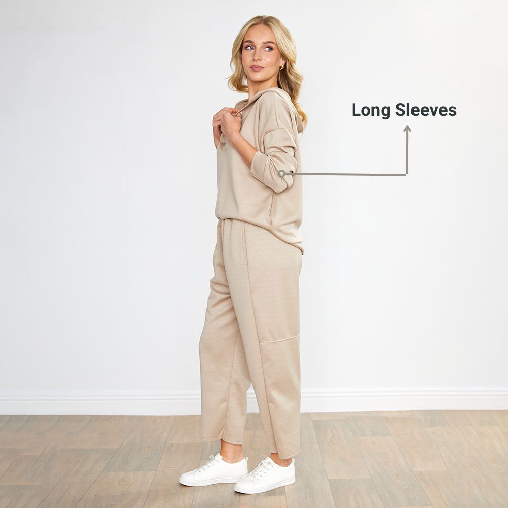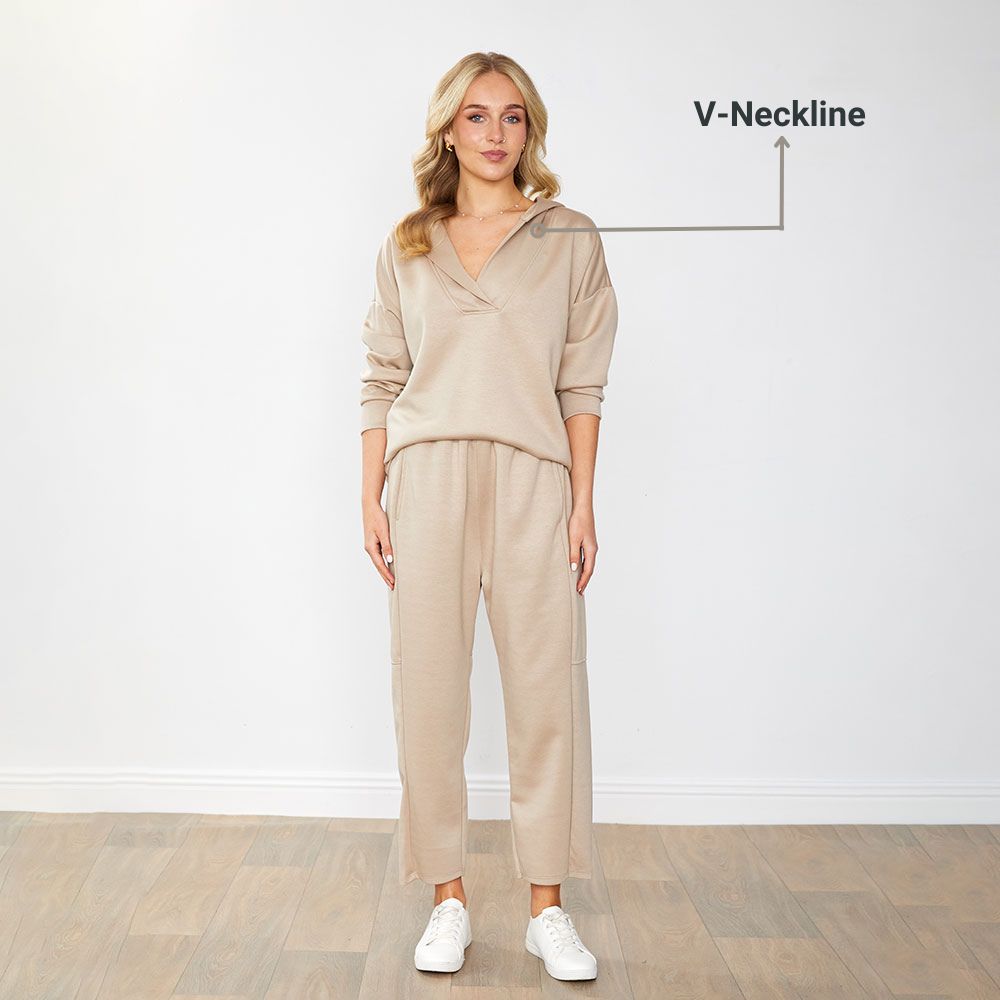 Featuring a V-neckline with hood, relaxed fit, and practical pockets, it’s loungewear made luxe.