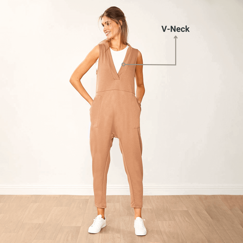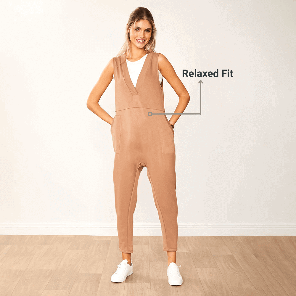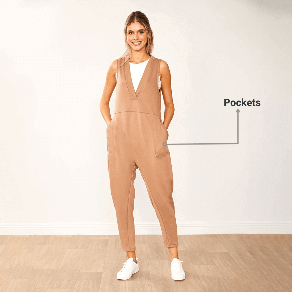 Featuring a v-neck, sleeveless design, and convenient pockets, this jumpsuit offers both comfort and style.