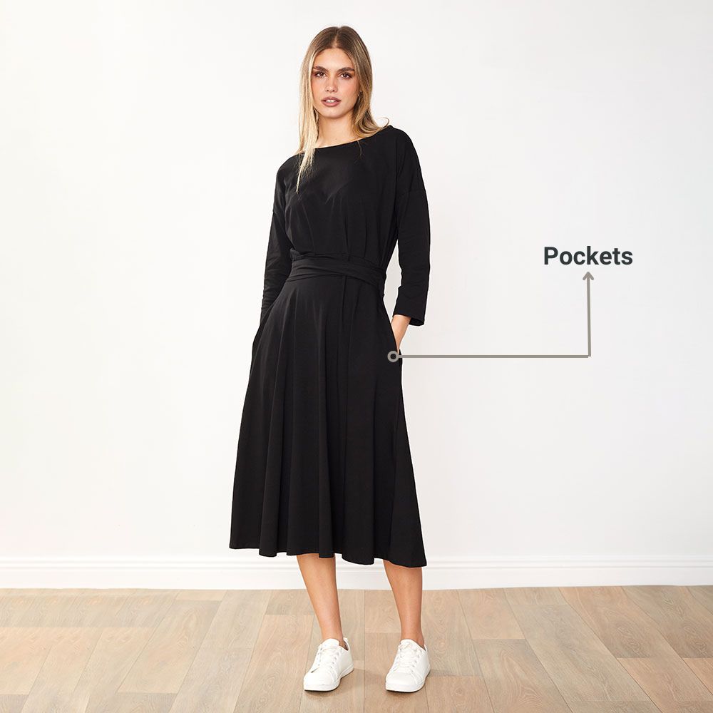 Effortless charm, all tied up. With its boat neckline, flattering 3/4 sleeves, and a tie-waist belt that defines your shape, the Nessa Dress is your go-to for chic comfort. Add a relaxed fit bodice and those all-important pockets, and you’ve got everyday elegance made easy.