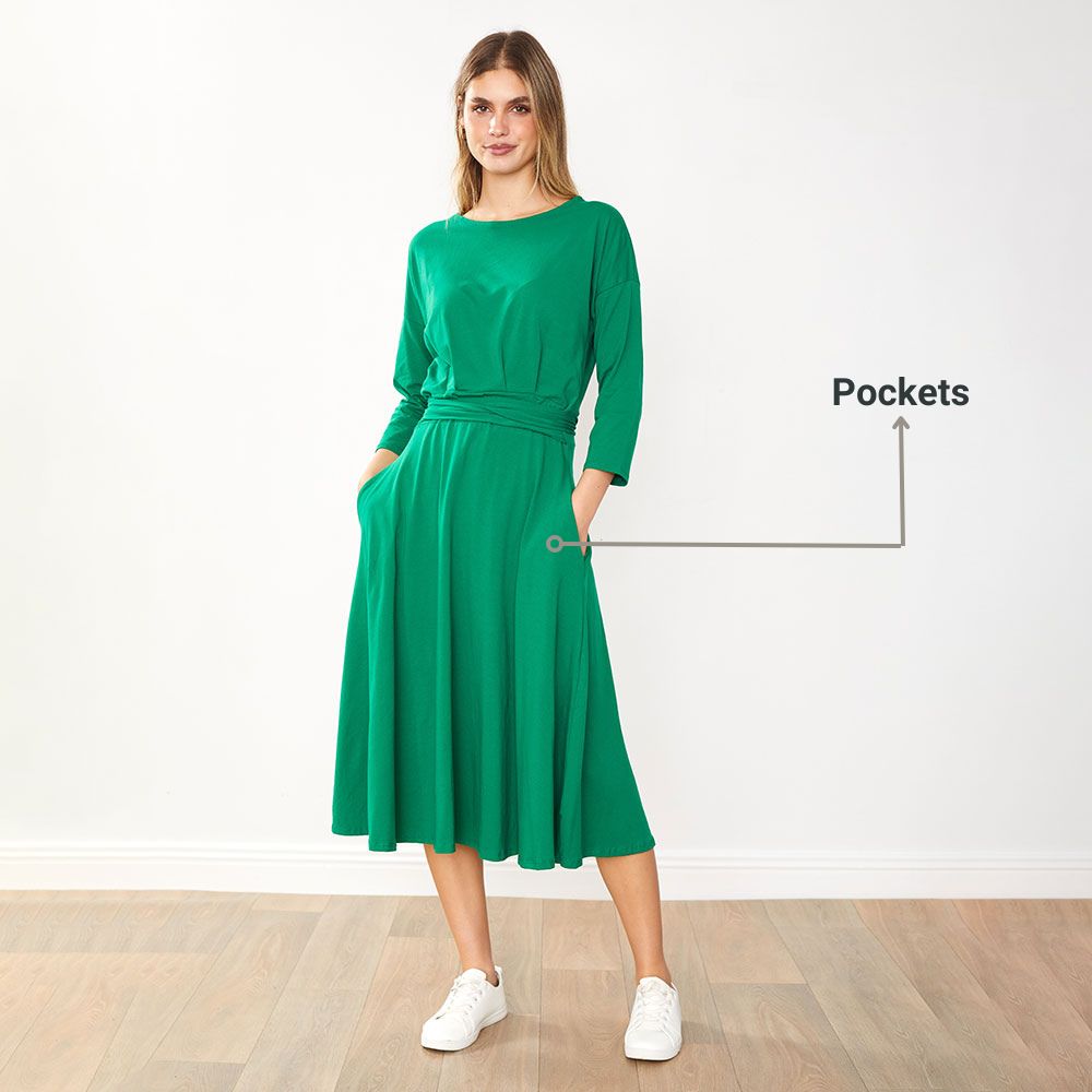 Effortless charm, all tied up. With its boat neckline, flattering 3/4 sleeves, and a tie-waist belt that defines your shape, the Nessa Dress is your go-to for chic comfort. Add a relaxed fit bodice and those all-important pockets, and you’ve got everyday elegance made easy.
