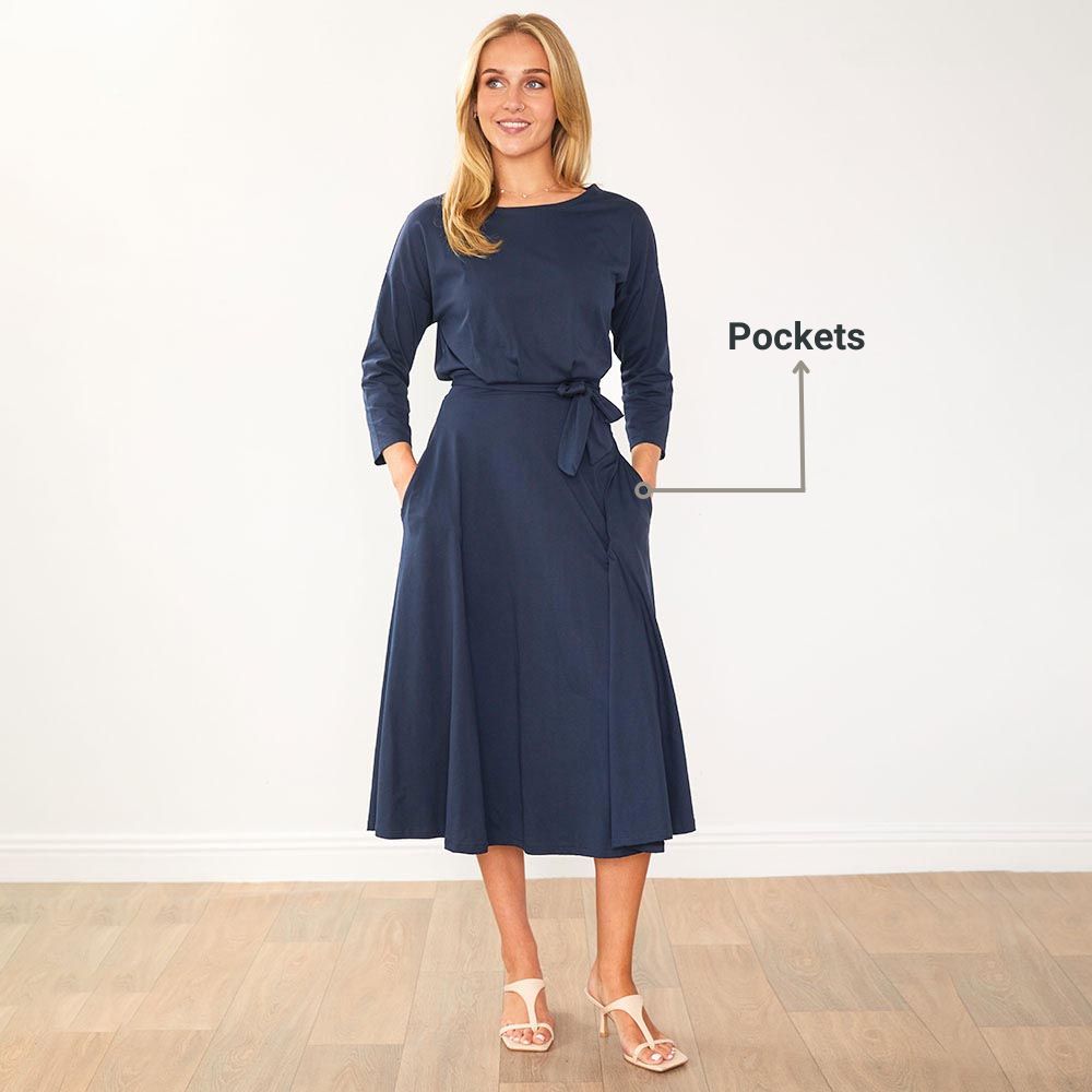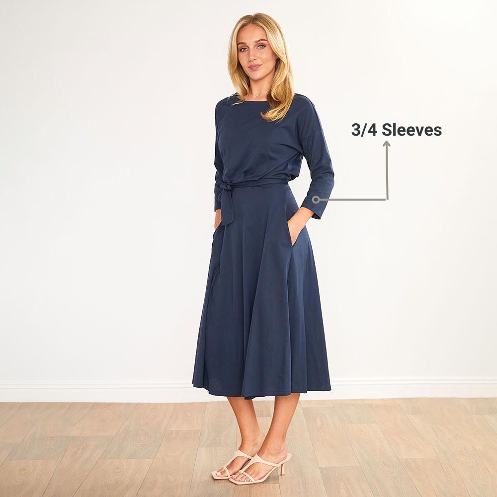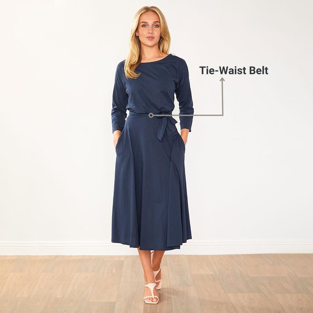 Effortless charm, all tied up. With its boat neckline, flattering 3/4 sleeves, and a tie-waist belt that defines your shape, the Nessa Dress is your go-to for chic comfort. Add a relaxed fit bodice and those all-important pockets, and you’ve got everyday elegance made easy.