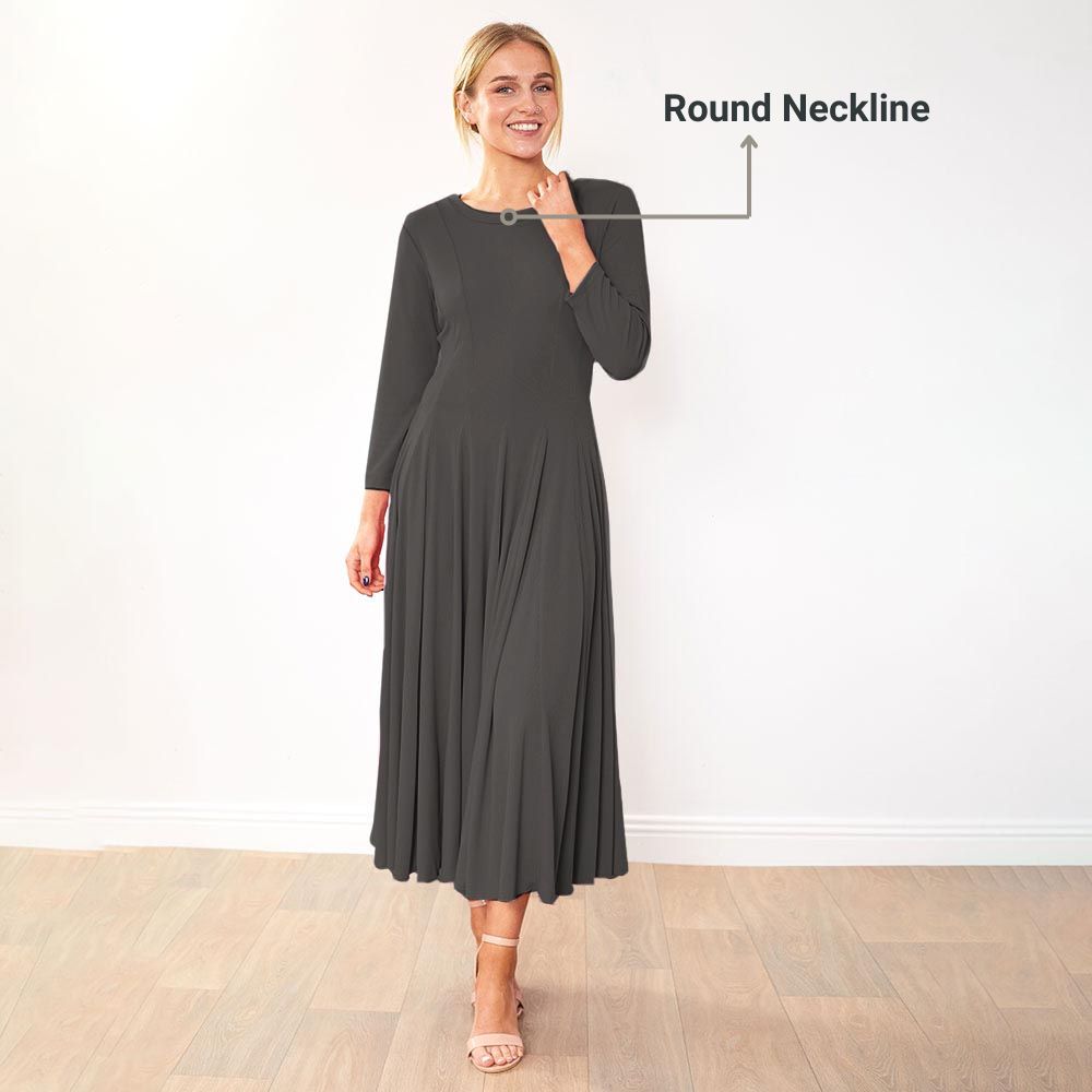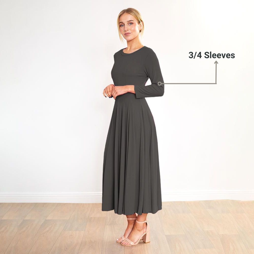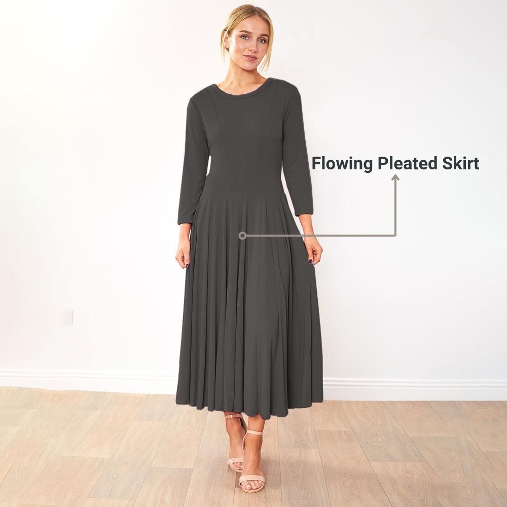 Designed to flatter and flow, she features chic 3/4 Sleeves, a sleek Fitted Bodice, and a Defined Waist Seam that shapes beautifully. The Flowing Pleated Skirt moves with you effortlessly, creating a silhouette that’s as elegant as it is comfortable. ✨
