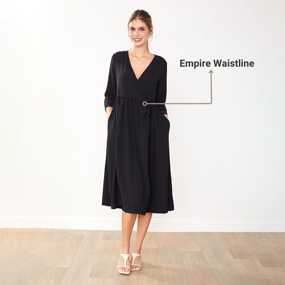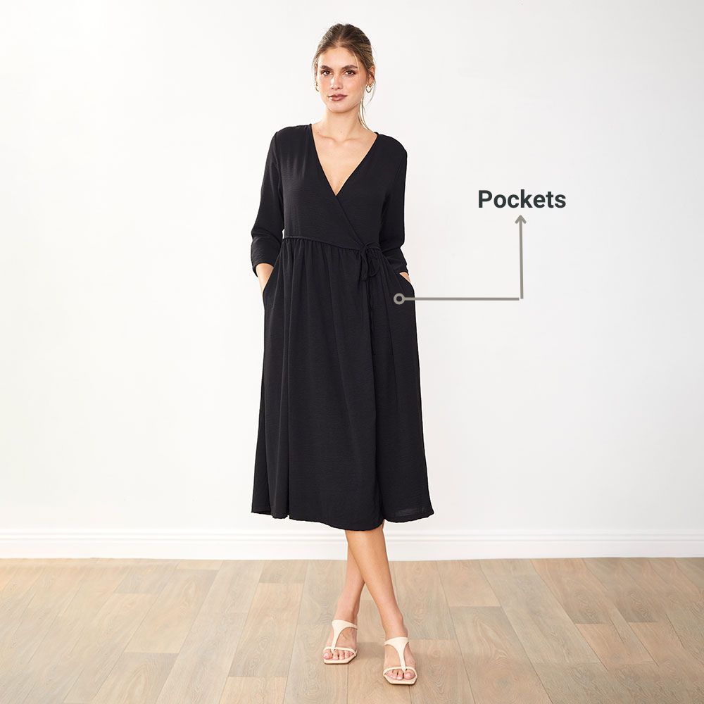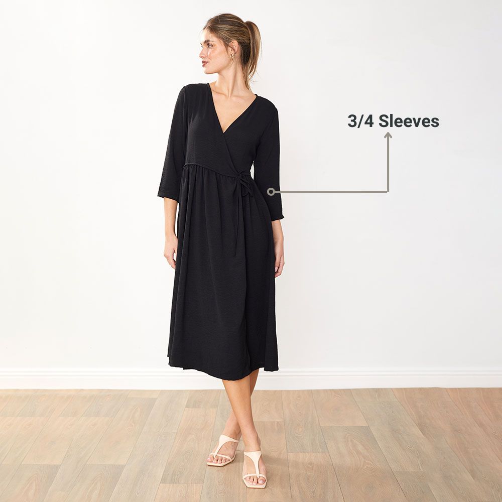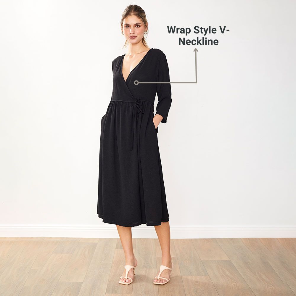 The Rex Dress brings effortless charm with its wrap-style V-neckline, adjustable waist tie, and flowy midi silhouette. Finished with 3/4 sleeves and hidden pockets, it’s equal parts comfy and polished — ready for anything from desk to dinner.