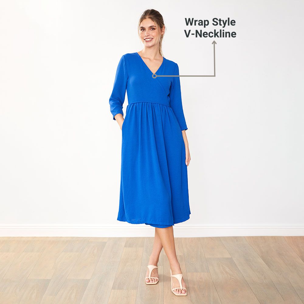 The Rex Dress brings effortless charm with its wrap-style V-neckline, adjustable waist tie, and flowy midi silhouette. Finished with 3/4 sleeves and hidden pockets, it’s equal parts comfy and polished — ready for anything from desk to dinner.
